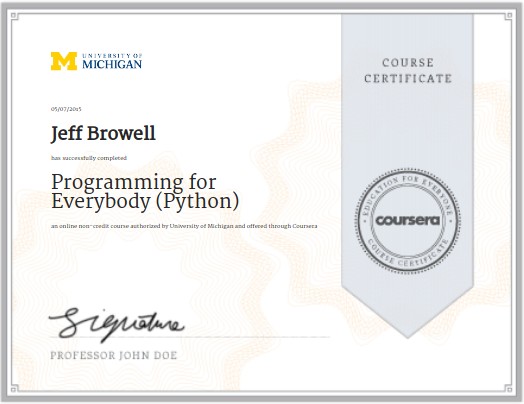 Here is a certificate from Coursera for learning Python 2.7.  This certificate can be verified at: https://coursera.org/share/b14c40b8d3d1c63eb6cbbc85242492a6